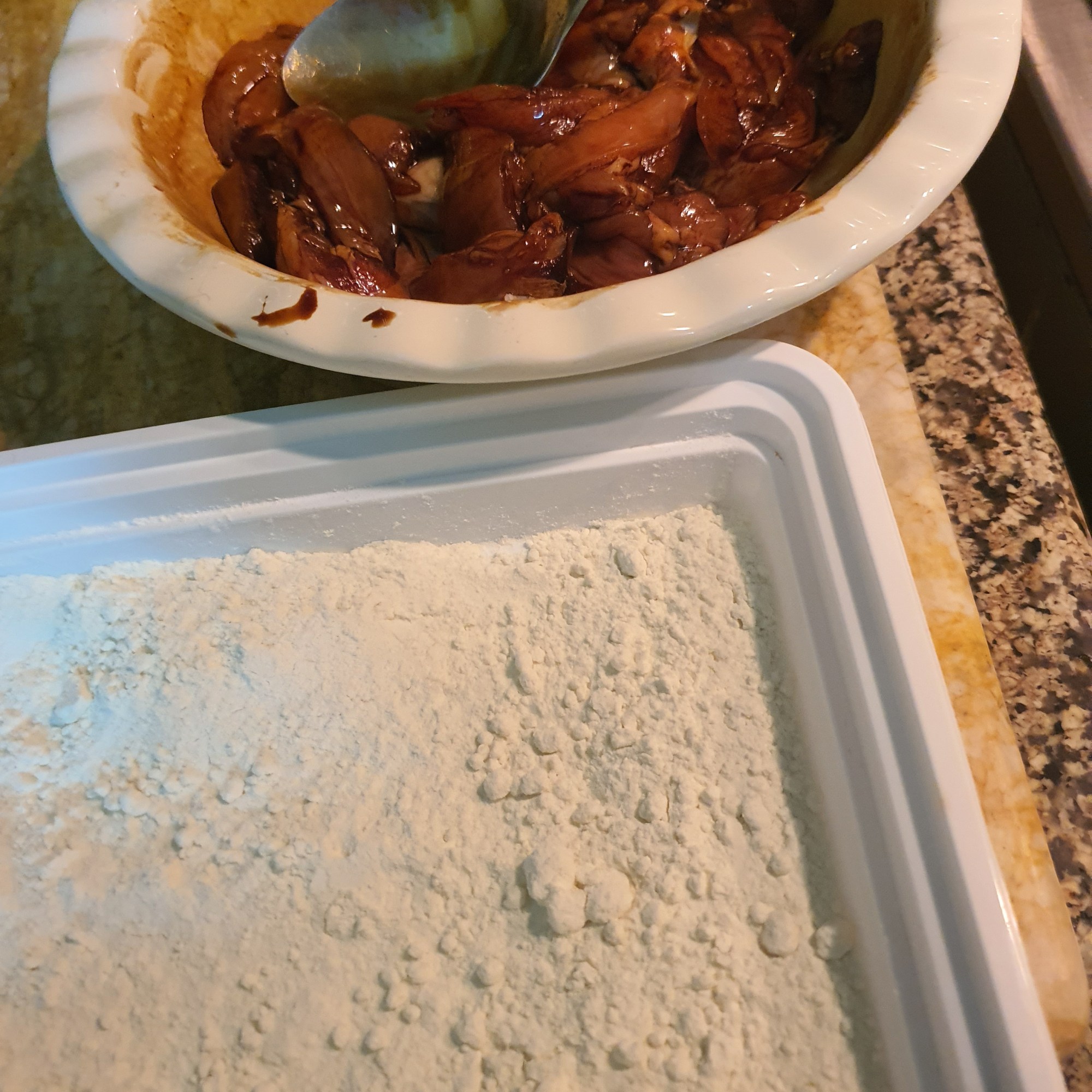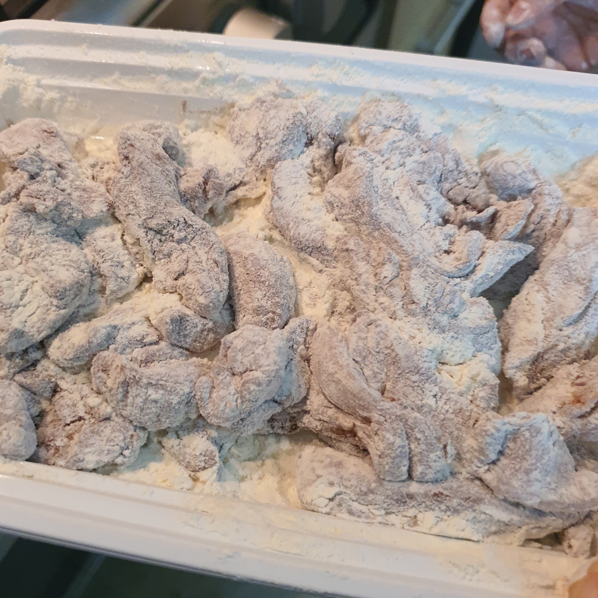 Put the flour into a box with a lid, add the chicken and then shake it (with the lid on!) until the chicken is well coated in flour. Take a small but deep frying pan and heat a cm of oil, when it is hot add the chicken. Do not stir the chicken – this will knock the flour off and then it wouldn’t become crispy. Instead, leave the chicken to cook for a few minutes and then gently toss the chicken in the oil. Continue to toss the chicken until it becomes nice and crispy, then turn off the heat and set the chicken aside until the sauce is complete.