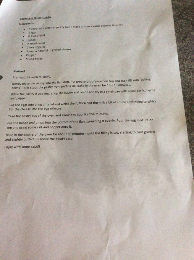 Emma and I continue to cook together on a Monday. This week it was quiche, my mum’s recipe. We didn’t quite follow it; I think that we added an extra egg in because it looked a little bit too runny.